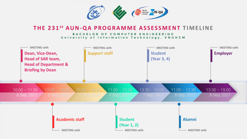 Chúng ta hãy cùng điểm qua các mốc thời gian phỏng vấn quan trọng trong lần kiểm định AUN-QA chương trình Kỹ thuật Máy tính, trường ĐH Công nghệ Thông tin, ĐHQG-HCM qua hình dưới đây nhé