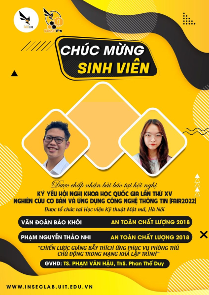 Chúc mừng nhóm sinh viên ngành An toàn thông tin - Khoa Mạng máy tính & Truyền thông, Văn Đoàn Bảo Khôi và Phạm Nguyễn Thảo Nhi, nhóm nghiên cứu InSecLab đã có công trình nghiên cứu được chấp nhận đăng tại Kỷ yếu Hội nghị khoa học quốc gia lần thứ XV - Nghiên cứu cơ bản và ứng dụng công nghệ thông tin (FAIR2022). Hội nghị FAIR2022 năm nay được tổ chức với chủ đề chính "An toàn và bảo mật thông tin trong cuộc Cách mạng Công nghiệp lần thứ IV" tại Học viện Kỹ thuật Mật mã, Hà Nội vào hai ngày 03-04.11.2022 sắp tới.