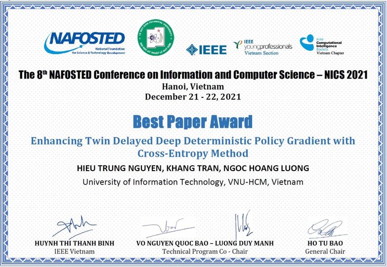 Sinh viên Nguyễn Trung Hiếu và Trần Đình Khang đã được nhận Best Paper Award trong hội nghị NICS 2021 lớp KHTN2018 dưới sự hướng dẫn của Thầy Lương Ngọc Hoàng.