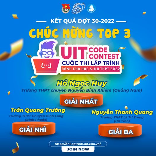 Trường Đại học Công nghệ Thông tin xin được chúc mừng Top 3 thí sinh xuất sắc nhất cuộc thi UIT Code Contest đợt 31 - 2022