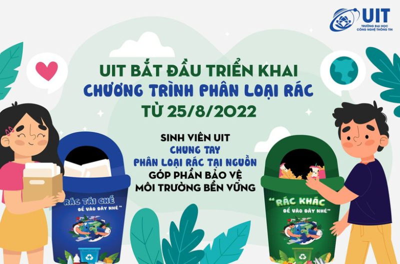 Từ ngày 25/8/2022, UIT bắt đầu triển khai chương trình "Phân loại rác". Trường sẽ bố trí số lượng thùng rác phù hợp xung quanh khuôn viên trường, mỗi thùng có ký hiệu riêng ở phía trước nhằm phân biệt và thúc đẩy sinh viên tích cực phân loại rác tại nguồn đúng cách. UIT-ers hãy chung tay thực hiện phân loại rác tại nguồn góp phần bảo vệ môi trường bền vững nhé!