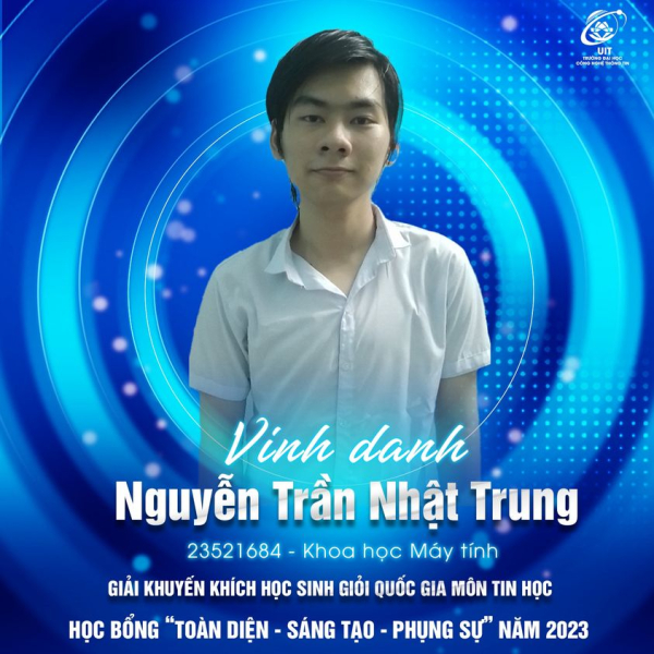 Xin được giới thiệu đến tất cả một trong số những chủ nhân của học bổng "TOÀN DIỆN - SÁNG TẠO - PHỤNG SỰ" NĂM 2023 được UIT trao tặng: Nguyễn Trần Nhật Trung, học sinh Trường THPT Bình Minh trúng tuyển UIT và đang theo học lớp Trí tuệ Nhân tạo khóa 2023