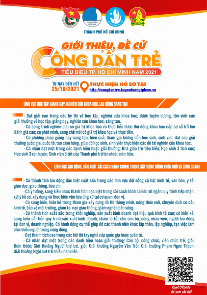 Nhằm mục đích ôn vinh những thanh niên điển hình của Thành phố, những người đang từng ngày nỗ lực trong học tập, lao động; sáng tạo trong nghiên cứu; tận tâm trong công việc; sống trọn với đam mê và tỏa sáng giữa đời thường, Thành đoàn thành phố Hồ Chí Minh tổ chức cuộc vận động bình chọn công dân trẻ tiêu biểu TP. Hồ Chí Minh năm 2021.