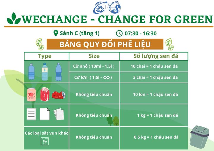 Chương trình “Tình nguyện Thứ 7 - Chủ Nhật xanh” của khoa Công nghệ Phần mềm sẽ bắt đầu vào giai đoạn “thi công”. Bên dưới đây là “Bảng quy đổi” do BTC đề ra, chỉ cần các bạn thu gom đủ số lượng của một hay nhiều loại vật liệu được đặt ra thì sẽ nhận lại số lượng chậu sen đá tương ứng