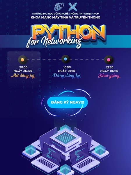 Lớp Python for Networking là 1 khóa học ngắn, với mục tiêu tạo ra môi trường học thuật giúp sinh viên Khoa MMT&TT củng cố và phát huy kiến thức mạng máy tính, đồng thời trau dồi kỹ năng lập trình. Sau khóa học này, bạn có thể tích lũy cho mình những hành trang hữu ích trên con đường theo đuổi sự nghiệp Dev, Quản trị mạng, …