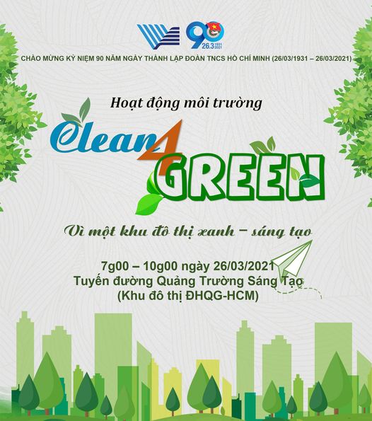 Tuổi trẻ Đại học Quốc gia TP.HCM tổ chức chương trình hoạt động môi trường Clean4green. Đây là một trong những hoạt động nhằm chào mừng 90 năm thành lập Đoàn TNCS Hồ Chí Minh, giữ môi trường trong lành, sạch đẹp.