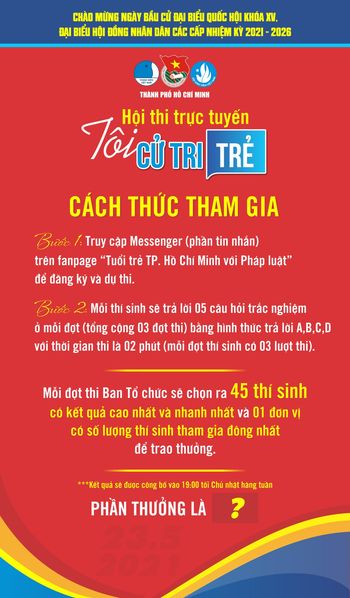Tuổi trẻ TP.HCM với Pháp luật tổ chức đợt thi trực tuyến của Hội nghị "Tôi - cử tri trẻ". Đây là cuộc thi tìm hiểu về Luật bầu cử Quốc hội và bầu cử Hội đồng Nhân dân, các vấn đề về cuộc bầu cử Quốc hội khóa XV và đại biểu Hội đồng nhân dân các cấp nhiệm kỳ 2021 - 2026.