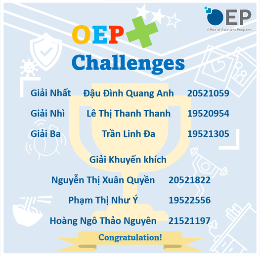 Vậy là OEP Challenges đã khép lại, hẹn gặp lại các bạn trong các hoạt động kế tiếp của OEP nhé. Một lần nữa, gửi lời cảm ơn đến các bạn sinh viên dành sự quan tâm và tham gia các thử thách của OEP Challenges nhé. Đừng quên giữ gìn sức khỏe, bảo vệ bản thân khỏi dịch Covid nha.