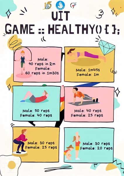 Yêu cầu đạt tiêu chí Thể lực tốt: Hoàn thành 4/6 nội dung bất kỳ. Ngoài ra các bạn sẽ được cộng điểm rèn luyện nếu hoàn thành 1/6 nội dung cuộc thi