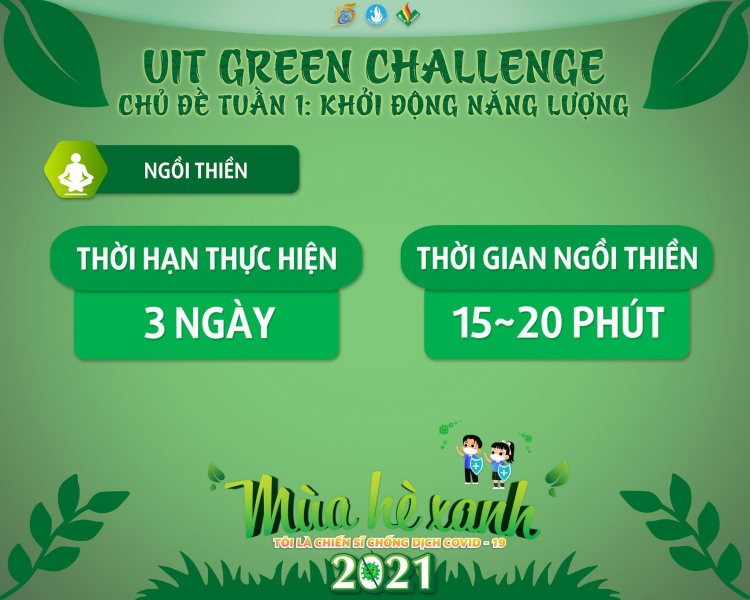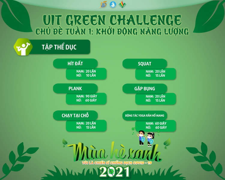 Chuỗi hoạt động UIT Green Challenge được diễn ra trong 4 tuần, với chủ đề tuần đầu tiên: KHỞI ĐỘNG NĂNG LƯỢNG sẽ giúp các bạn "warm up" sau nhiều ngày tẻ nhạt và buồn chán. Trong thời gian giãn cách này, ngoài việc hạn chế ra ngoài thì bạn còn có thể tham gia vào những hoạt động đơn giản và thú vị giúp đóng góp 10.000đ vào quỹ Covid - 19