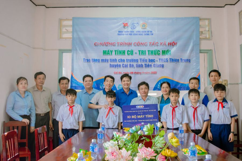 Sáng hôm nay, chuyến xe của Đội Máy tính cũ - Tri thức mới đã lăn bánh đến trường Tiểu hoc - THCS Thiện Trung, huyện Cái Bè, tỉnh Tiền Giang hỗ trợ Đoàn Thanh Niên - Công Đoàn cơ sở Trường Đại học Công nghệ Thông tin, ĐHQG-HCM trao tặng 10 bộ máy vi tính nhằm phục vụ công tác dạy học cũng như tạo điều kiện cho các em học sinh tiếp cận với các kiến thức tin học.