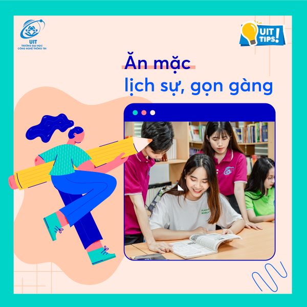 Nếu bạn thuộc hệ đơn giản thì đúng nghĩa đơn giản bạn chỉ cần “áo trắng đến trường”, năng động trong màu áo của Trường cùng tóc tai gọn gàng, sạch sẽ là bạn đã đạt chuẩn ở nét văn minh này rồi. Nếu cần nổi bậc thì những chiếc áo sơ mi, áo thun phối cùng quần jean cá tính hay chiếc áo hoodie dễ thương phối cùng váy ngắn,…cũng dễ dàng khiến các bạn trở nên nổi bật, năng động và thoải mái trong suốt ngày học. Ở UIT khuyến khích các bạn mặc áo UIT, áo khoa, áo các hoạt động, chương trình của Trường....tóm lại chính là những chiếc áo tự hào có logo UIT.