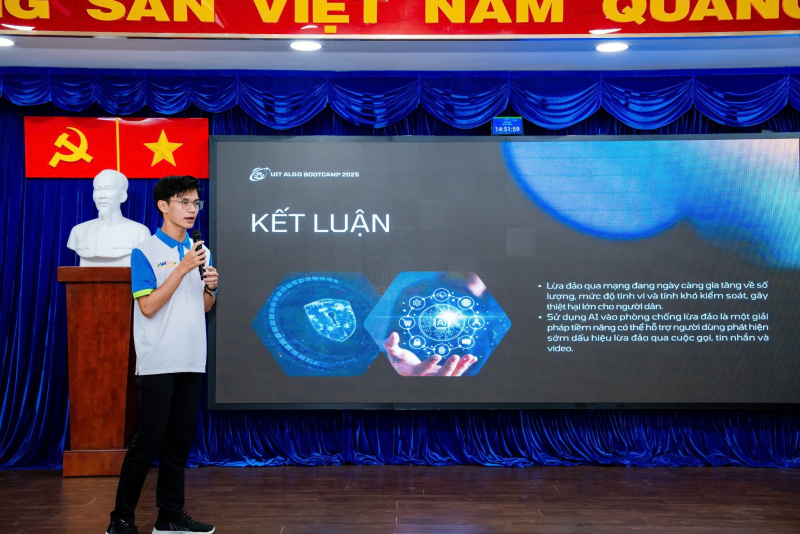 Trại sinh tham gia UIT Algo Bootcamp 2025 trình bày về ý tưởng khởi nghiệp sáng tạo liên quan đến AI