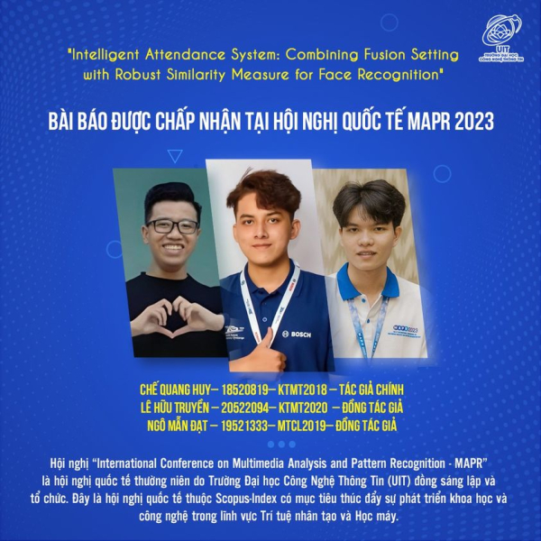 Hội nghị “International Conference on Multimedia Analysis and Pattern Recognition - MAPR” là hội nghị quốc tế thường niên do Trường Đại học Công Nghệ Thông Tin (UIT) đồng sáng lập và tổ chức. Đây là hội nghị quốc tế thuộc Scopus-Index có mục tiêu thúc đẩy sự phát triển khoa học và công nghệ trong lĩnh vực Trí tuệ nhân tạo và Học máy. Mục tiêu của hội nghị này là tập hợp các nhà nghiên cứu và chuyên gia từ cả học viện và ngành công nghiệp để chia sẻ những kết quả nghiên cứu mới nhất, kết quả thử nghiệm và củng cố cơ hội hợp tác tiềm năng về nhận dạng mẫu, phân tích đa phương tiện và các lĩnh vực liên quan. Một số chủ đề mà hội nghị quan tâm đến như: Pattern Recognition and Machine Learning, Multimedia Analysis, Biomedical Image Analysis and Biometrics, Computer Vision and Robot Vision, Document Analysis and Recognition, Applications,... Hội nghị khoa học quốc tế lần thứ 6 MAPR 2023 do Trường Đại học Công nghệ Thông tin (UIT) - Đại học Quốc gia Thành phố Hồ Chí Minh, phối hợp cùng các đơn vị VAPR (Vietnamese Association on Pattern Recognition), Đại học Bách khoa Hà Nội (HUST), Viện Công nghệ Thông tin (IOIT) tổ chức tại Quy Nhơn, Bình Định trong 2 ngày 05 và 06/10/2023. Hội nghị quy tụ nhiều nhà khoa học, nghiên cứu sinh, học viên cao học và sinh viên đến từ nhiều quốc gia trên thế giới, bao gồm Mỹ, Pháp, Nhật Bản, Malaysia, Việt Nam. Là lần thứ 6 tổ chức và với việc các bài báo của hội nghị MAPR được xuất bản trên IEEEXplore và nằm trong danh mục Scopus cho thấy hội nghị MAPR đã đạt được những thành công nhất định trong việc thúc đẩy sự phát triển của lĩnh vực phân tích đa phương tiện và nhận dạng Việt Nam và thế giới.