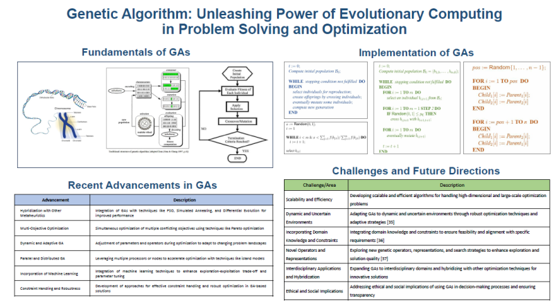 Bài báo nói về Thuật toán di truyền (GA) là một lớp thuật toán tối ưu hóa lấy cảm hứng từ các nguyên tắc chọn lọc tự nhiên và di truyền. Chúng đã trở nên phổ biến đáng kể trong nhiều lĩnh vực khác nhau nhờ khả năng giải quyết hiệu quả các vấn đề phức tạp và tối ưu hóa các giải pháp. Bài viết này cung cấp cái nhìn tổng quan về GA, nguyên lý hoạt động, ứng dụng của chúng trong giải quyết vấn đề và tối ưu hóa. Bài viết cũng thảo luận về những ưu điểm và hạn chế của GA và cung cấp những hiểu biết sâu sắc về hướng nghiên cứu trong tương lai trong lĩnh vực này.
