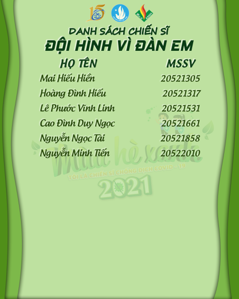 Mùa hè xanh là hoạt động tình nguyện thường niên của trường Đại học Công nghệ Thông tin. Nơi mang đến cho các bạn sinh viên những trải nghiệm, vốn sống, giao lưu, kết thêm nhiều bạn bè mới và trách nhiệm xã hội
