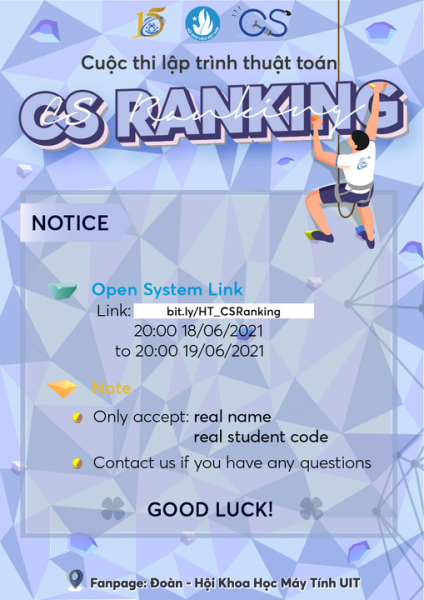CS Ranking là cuộc thi học thuật leo hạng theo cấp độ do Đoàn - Hội Khoa học Máy tính tổ chức dành cho các sinh viên từ K12 - k15 trường Đại học Công nghệ Thông tin.