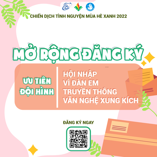 Nếu bạn chưa kịp điền form đăng ký tham gia chiến dịch Mùa hè xanh 2022 thì chưa phải là “chấm hết” đâu nha. Còn chần chờ chi khi chiến dịch siêu thú vị này sẽ mở rộng thêm một ngày đăng ký ưu tiên cho 4 đội hình: