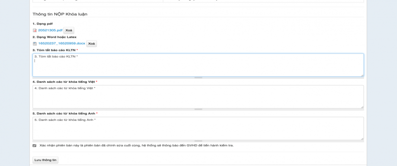 - Sau khi nhập đầy đủ thông tin, sinh viên xác nhận nộp KLTN bằng cách chọn (check) vào dòng sau đây: “Xác nhận phiên bản này là phiên bản đã chỉnh sửa cuối cùng, hệ thống sẽ thông báo đến GVHD để tiến hành kiểm tra”.