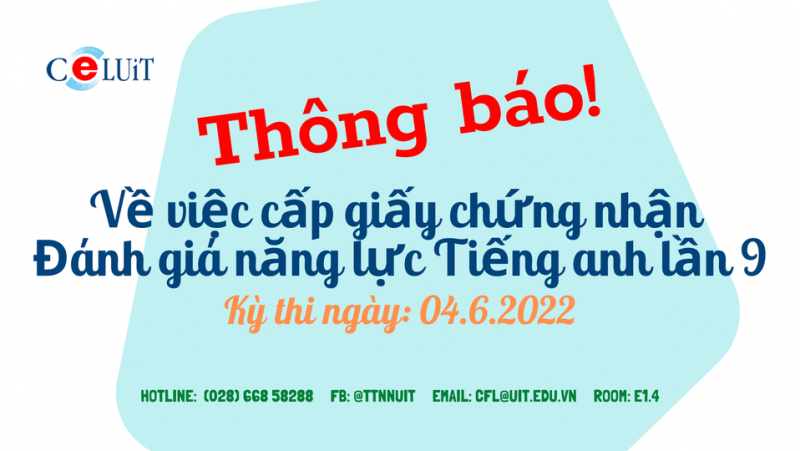 Kể từ ngày 7/7/2022 sinh viên tham dự kỳ thi đánh giá năng lực lần 9, ngày 6/4/2022 tiến hành nhận giấy chứng nhận kết quả thi tại Văn phòng Trung tâm Ngoại ngữ, phòng E1.4 trong giờ hành chính từ thứ 2-6.