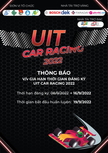 Sau khi nhận được khá nhiều tin nhắn các bạn thí sinh muốn đăng ký tham gia cuộc thi UIT CAR RACING 2022 <từ khắp mọi miền đất nước> nhưng chưa kịp tìm được đội, BTC cuộc thi quyết định gia hạn thời gian đăng ký cuộc thi đến ngày 16/9/2022.