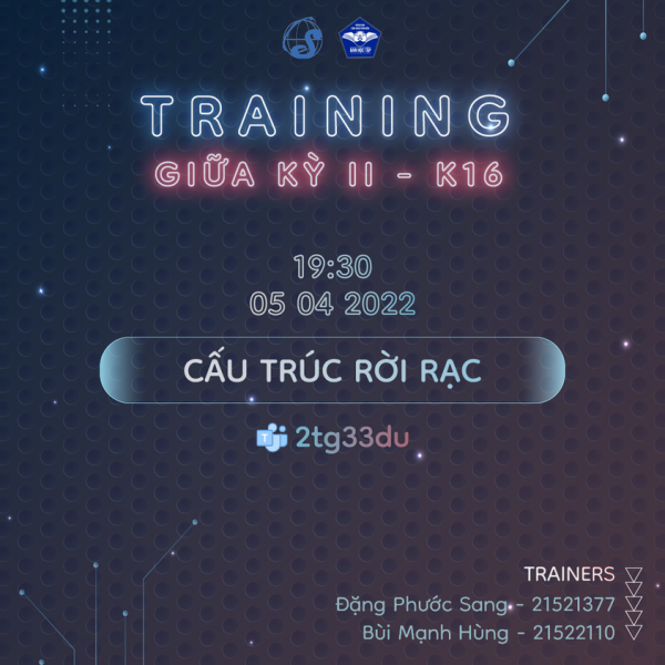 Tối ngày 4/4/2022, buổi training ôn tập môn Cấu trúc Dữ liệu và Giải thuật do ban học tập Công nghệ Phần mềm tổ chức đã diễn ra thành công tốt đẹp.
