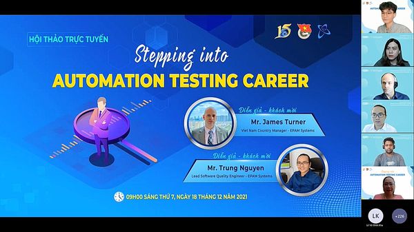 Sáng ngày 18/12/2021, Đoàn khoa Hệ thống Thông tin phối hợp cùng công ty EPAM System đã tổ chức thành công buổi webinar với sự tham gia của gần 300 bạn sinh viên UIT. Buổi webinar đã giúp các bạn sinh viên có thêm nhiều kiến thức bổ ích về nghề Automation Testing và văn hóa làm việc trong một môi trường đa quốc gia. Với sự chia sẻ tận tình từ anh Nguyễn Tấn Trung về những kiến liên quan đến Automation Testing. Bên cạnh đó, sinh viên đã có thêm cơ hội trau dồi khả năng tiếng anh của mình cùng hai diễn giả nước ngoài là Mr. James Turner và Mr. Karthik Lakshmanan.