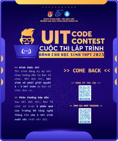 UIT Code Contest là cuộc thi nhằm tìm kiếm những code talent trong khối THPT, đồng thời tổ chức sân chơi lành mạnh để so tài và bổ ích để trau dồi thêm kiến thức và kỹ năng