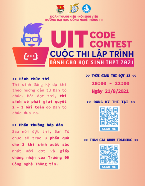 UIT Code Contest là cuộc thi nhằm tìm kiếm những code talent trong khối THPT, đồng thời tổ chức sân chơi lành mạnh để so tài và bổ ích để trau dồi thêm kiến thức và kỹ năng.
