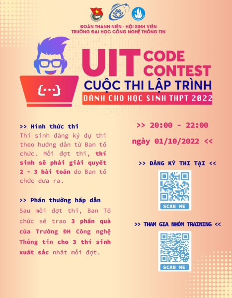 UIT Code Contest là cuộc thi nhằm tìm kiếm những code talent trong khối THPT, đồng thời tổ chức sân chơi lành mạnh để so tài và bổ ích để trau dồi thêm kiến thức và kỹ năng.