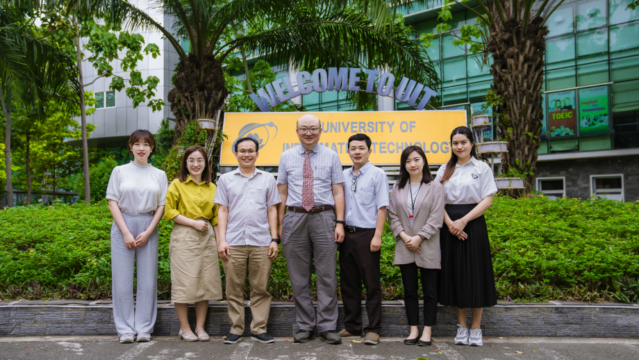 Đại diện UIT đón tiếp đoàn và trao đổi hợp tác gồm PGS.TS Lê Đình Duy - Trưởng phòng, Phòng Đào tạo Sau Đại học & Khoa học Công nghệ cùng TS. Nguyễn Minh Sơn - Trưởng khoa Kỹ thuật Máy tính.