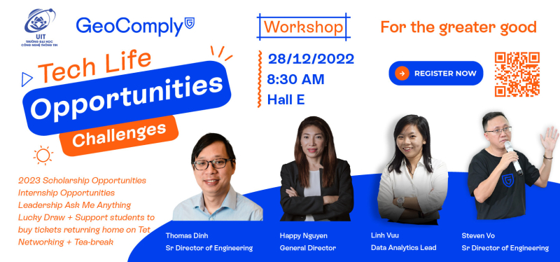Để chuẩn bị cho một học kỳ mới đầy hứng khởi, Trường Đại Học Công Nghệ Thông Tin phối hợp với công ty GeoComply tổ chức buổi Workshop “TECH LIFE - OPPORTUNITIES & CHALLENGES" nhằm giải đáp những thắc mắc và giúp sinh viên định hướng tốt hơn khi lựa chọn ngành CNTT. Đây cũng là cơ hội giao lưu, kết nối và gặp gỡ giữa các sinh viên đang theo đuổi các khối ngành CNTT với các chuyên gia hàng đầu trong ngành đến từ GeoComply với những chia sẻ đầy thú vị và thực tế.