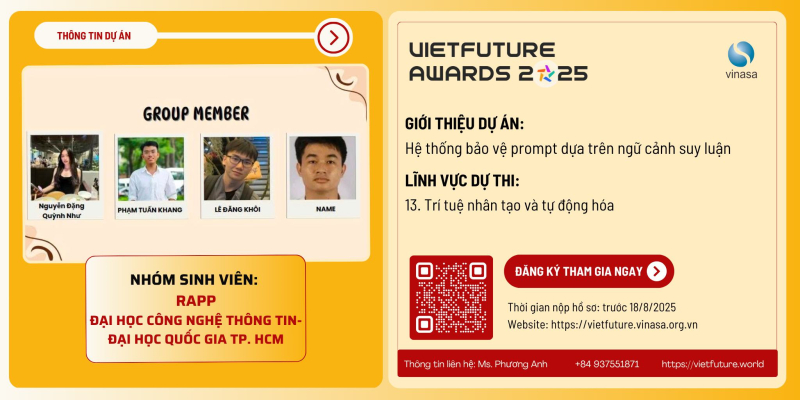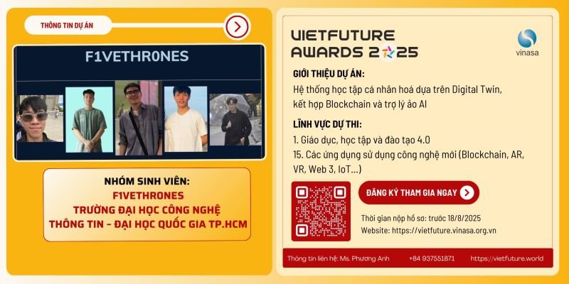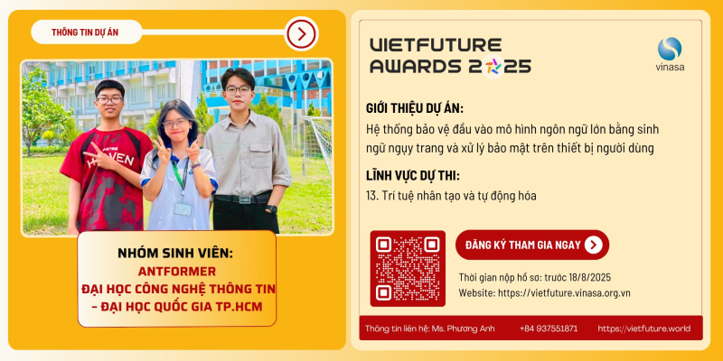 Các nhóm sinh viên của Trường Đại học Công nghệ thông tin – Đại học Quốc gia TP.HCM chính thức ghi danh tham gia VietFuture Awards 2025 – Giải thưởng công nghệ đổi mới sáng tạo dành cho thế hệ trẻ Việt Nam, do Hiệp hội Phần mềm và Dịch vụ CNTT Việt Nam (VINASA) tổ chức!