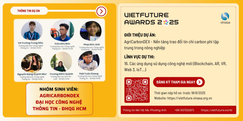 Nhóm thực hiện: AgriCarbonDEX, Đại học Công nghệ thông tin – Đại học Quốc gia TP.HCM. Gồm các sinh viên: Võ Trường Trung Hiếu, Trần Hữu Đức, Phan Đức Anh, Nguyễn Đặng Quỳnh Như, Thái Tuấn Khang, Trương Diễm Quỳnh