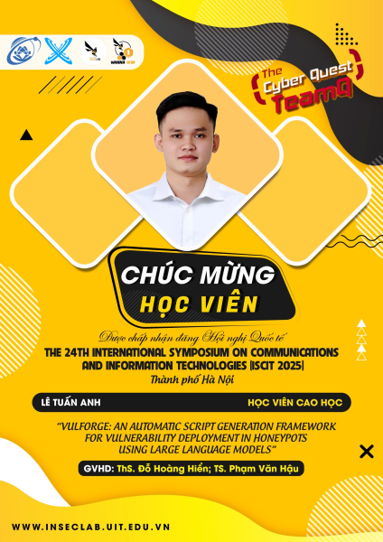 Chúc mừng học viên cao học Lê Tuấn Anh, với bài báo về khung sinh mã tự động cho triển khai lỗ hổng trong honeypot bằng mô hình ngôn ngữ lớn vừa được chấp nhận đăng tại Hội nghị khoa học quốc tế lần thứ 24 về Công nghệ Thông tin và Truyền thông (ISCIT 2025).