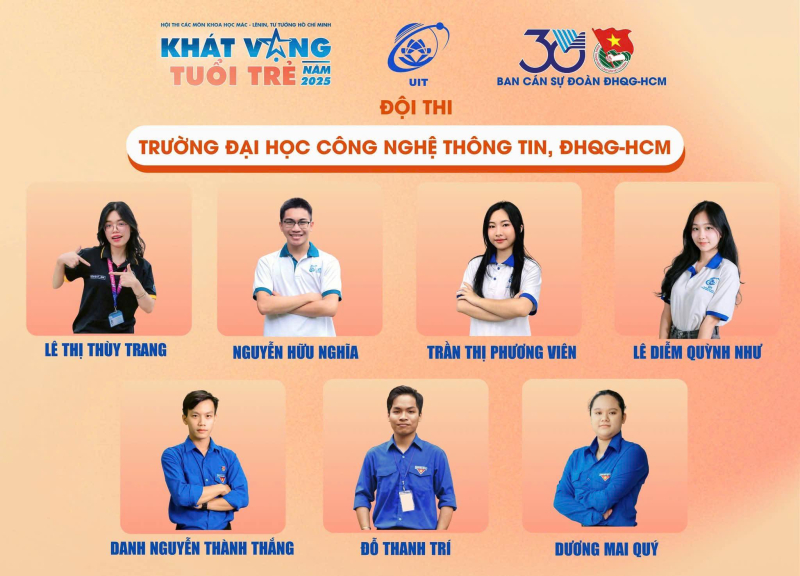 7 gương mặt ưu tú – đại diện cho bản lĩnh, trí tuệ và tinh thần nhiệt huyết của Tuổi trẻ Trường Đại học Công nghệ Thông tin sẽ chính thức góp mặt tại Hội thi các môn khoa học Mác – Lênin, Tư tưởng Hồ Chí Minh “Khát vọng tuổi trẻ” năm 2025, do Ban Cán sự Đoàn ĐHQG-HCM tổ chức.