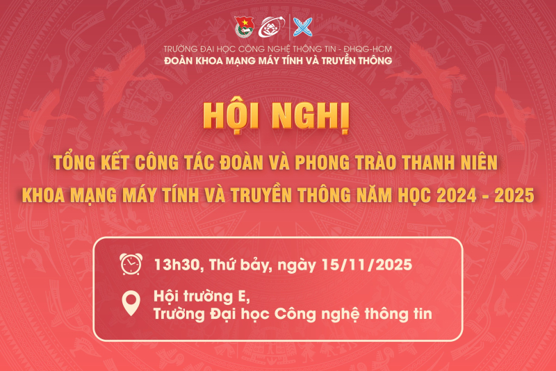 Đoàn khoa Mạng máy tính và Truyền thông trân trọng thông báo và kính mời quý đại biểu, cán bộ Đoàn – Hội, cùng toàn thể các bạn sinh viên tham dự Hội nghị Tổng kết công tác Đoàn và phong trào thanh niên Khoa Mạng máy tính và Truyền thông năm học 2024-2025.