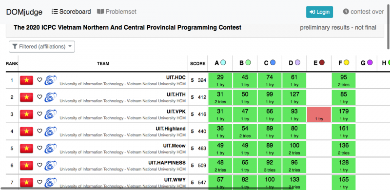 Các đội tuyển của UIT trong kỳ thi này mặc dù rất nỗ lực, nhưng rất tiếc chỉ dừng lại con số 5 bài. So với thành tích năm ngoái chỉ giải được 4 bài thì các đội tuyển của trường có sự tiến bộ nhất định.
