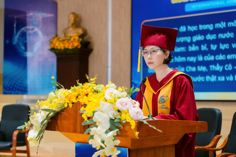 Đáp lại tình cảm và những lời chúc từ Ban Giám hiệu, đại diện sinh viên, tân cử nhân Hồ Thuỷ Kim Ngân đã bày tỏ lòng tri ân sâu sắc và chia sẻ cảm xúc chân thành trước những định hướng quý báu từ lãnh đạo Nhà trường, đồng thời khẳng định tinh thần nỗ lực của bản thân: “Đừng quá lo lắng. Hãy tạm gác lại mọi áp lực, cho mình một chút tự hào hôm nay. Cứ bình tĩnh bước theo lộ trình học tập của bạn, rồi con đường phù hợp sẽ dần mở ra.”