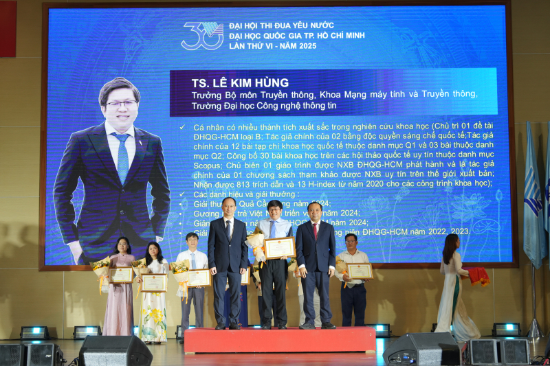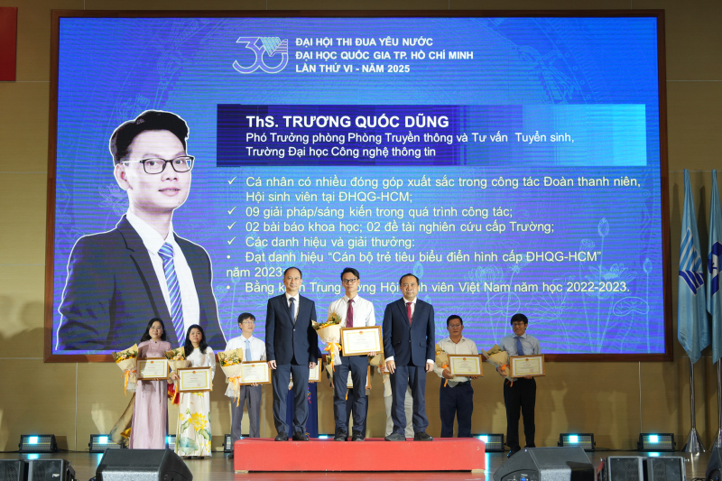 Trường Đại học Công nghệ Thông tin, ĐHQG-HCM vinh dự có TS. Lê Kim Hùng - Trưởng Bộ môn Truyền thông, Khoa Mạng máy tính và Truyền thông; và ThS. Trương Quốc Dũng - Phó Trưởng phòng Phòng Truyền thông và Tư vấn tuyển sinh, đã được vinh danh khen thưởng nhờ những thành tích xuất sắc, đóng góp tích cực trong công tác chuyên môn, phong trào thi đua yêu nước và sự phát triển chung của Nhà trường.