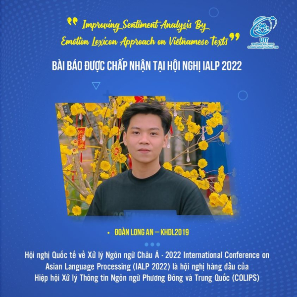 Chúc mừng sinh viên ngành Khoa học Dữ liệu Đoàn Long An có bài báo chấp nhận đăng tại Hội nghị Quốc tế về Xử lý Ngôn ngữ Châu Á - 2022 International Conference on Asian Language Processing (IALP 2022). Bài báo “Improving Sentiment Analysis By Emotion Lexicon Approach on Vietnamese Texts” được thực hiện dưới sự hướng dẫn của giảng viên ThS. Lưu Thanh Sơn.