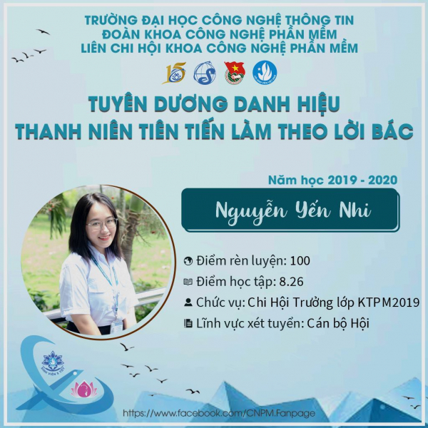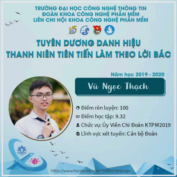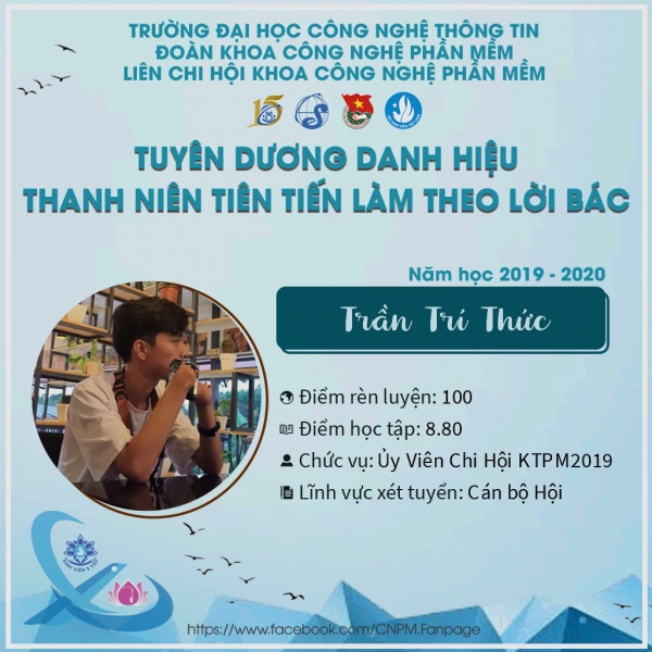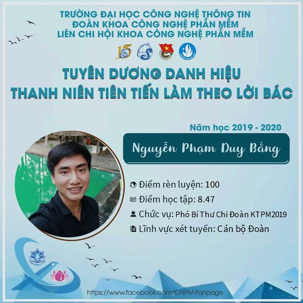 Danh hiệu “Thanh niên Tiên tiến làm theo lời Bác” cấp Khoa nhằm biểu dương, tôn vinh, nhân rộng các điển hình Thanh niên tiên tiến làm theo lời Bác của khoa Công nghệ Phần mềm Năm học 2019-2020, nhiều bạn sinh viên đã có nhiều thành tích xuất sắc trong học tập và hoạt động ngoại khóa.