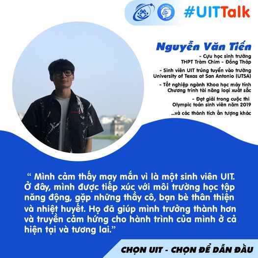Nguyễn Văn Tiến trải lòng: “Mình cảm thấy may mắn vì là một sinh viên UIT. Ở đây, mình được tiếp xúc với môi trường học tập năng động, gặp những thầy cô, bạn bè thân thiện và nhiệt huyết. Họ đã giúp mình trưởng thành hơn và truyền cảm hứng cho hành trình của mình ở cả hiện tại và tương lai.”