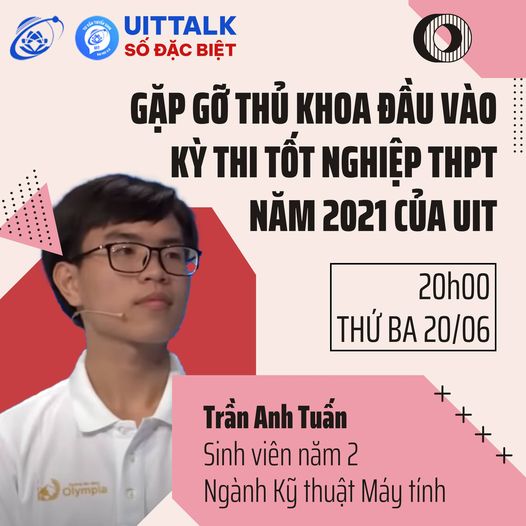 UITTalk đã có cuộc gặp gỡ Thủ khoa đầu vào 2021 bạn Trần Tuấn Anh - sinh viên năm 2 ngành Kỹ thuật Máy tính để lắng nghe câu chuyện thú vị nhé! Mời các bạn cùng lắng nghe tại: https://www.facebook.com/TuyenSinh.UIT/videos/175323525307738/